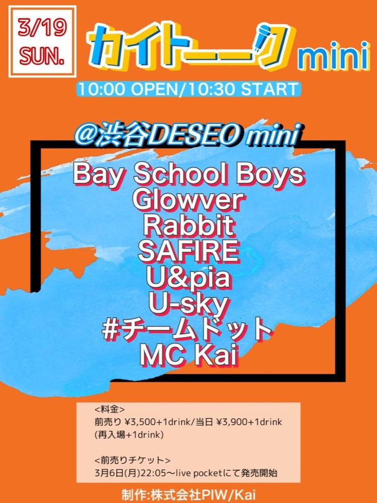 カイトーークmini SCHEDULE 2023/03/19(日) 渋谷deseo mini OPEN 10:00 / START 10:30 料金: 前¥3,500(1D別)/当日¥3,900(1D別) 出演:KanKan./PACHIKU/Az ※KEN./五味大地は欠席となります。 出演時間 11:35〜 物販 13:30〜 ↓チケ発3月6日(月)22:05〜↓ https://t.livepocket.jp/e/gy6td URLをコピーする 報告する