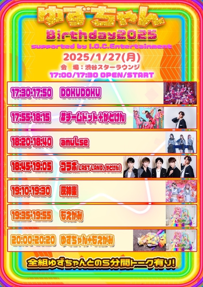 ゆずちゃんBirthday2025 SCHEDULE 2025/01/27(月) 渋谷スターラウンジ OPEN 17:10 / START 17:30 料金: 先着前売¥3,000(1D別)/当日¥4,000(1D別) 出演:KanKan./Gomi/PA-CHIKU/Az ※KEN.は欠席となります。 出演時間 17:55〜 物販 終演後〜 ↓チケットはコチラ↓ https://t.livepocket.jp/e/xbmi2 URLをコピーする 報告する